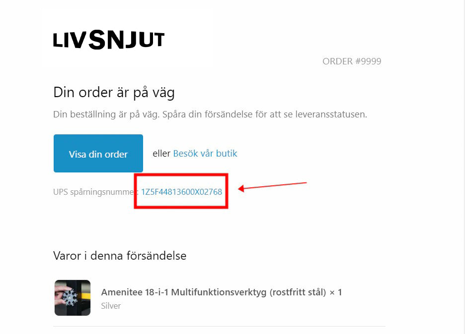 När din beställning har skickats skickar vi ett e-postmeddelande till dig om logistikinformationen, som innehåller spårningsnumret